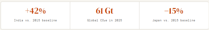 Against this backdrop, the global aggregate tells a more sobering story: total greenhouse gas emissions rose from 55 GtCO₂e in 2015 to 61 GtCO₂e in 2025 — a 10.9% increase that erases the progress made by declining nations and underscores how growth in the developing world is currently outpacing decarbonization efforts elsewhere.[FN6]
