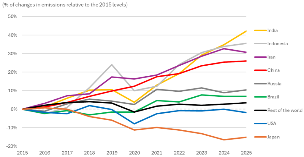 India leads all tracked nations with a 42% surge above its 2015 baseline by 2025, followed by Indonesia (+36%) and Iran (+31%), reflecting rapid industrial expansion and energy demand growth across the Global South.[FN2] China’s emissions climbed 26% over the decade, though Climate TRACE data show the rate of annual increase has slowed markedly in recent years — its power sector actually recorded its first-ever year-on-year decline in 2025.[FN3] Russia and Brazil posted modest but persistent growth (+10% and +7% respectively), while the “Rest of the World” aggregate held nearly flat (+3%), suggesting that emissions momentum is concentrated in a handful of high-growth economies.[FN4] At the other end of the spectrum, the United States has edged 2% below its 2015 level, and Japan stands out as the steepest decliner at −15%, a trend consistent with aggressive energy efficiency policy, nuclear restarts, and structural industrial contraction.[FN5]